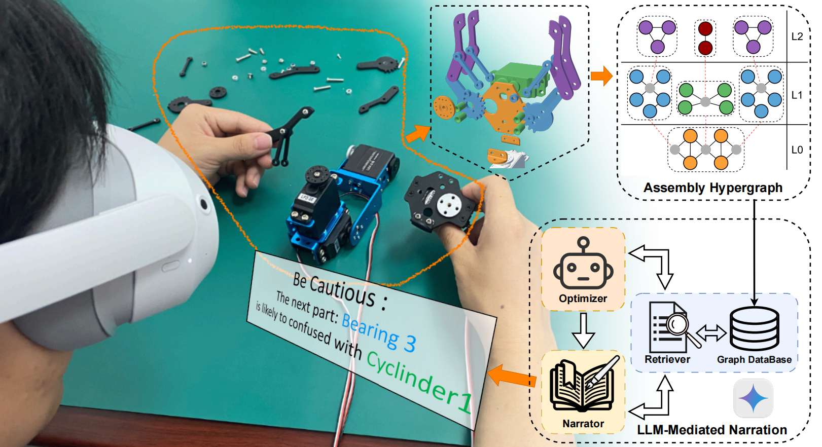 From Structure to Semantics: Hypergraph-Based AR Assembly Guidance with LLM-Mediated Narration Xinda Liu, Bowei Zhang, Jiaju Xu, Jian Wu*, Guohua Geng, Lili Wang IEEE Transactions on Visualization and Computer Graphics (IEEE TVCG) Also presented at IEEE Conference Virtual Reality and 3D User Interfaces (IEEE VR) PDFVideo
